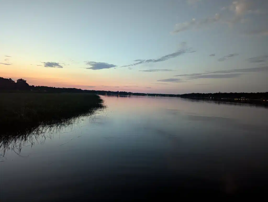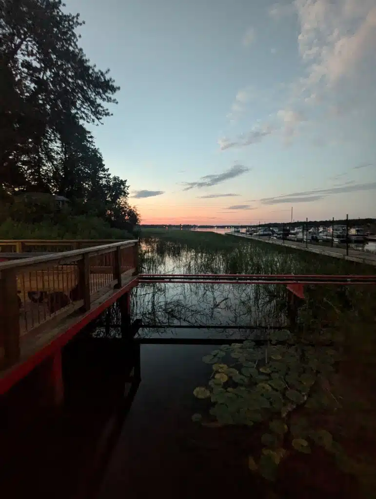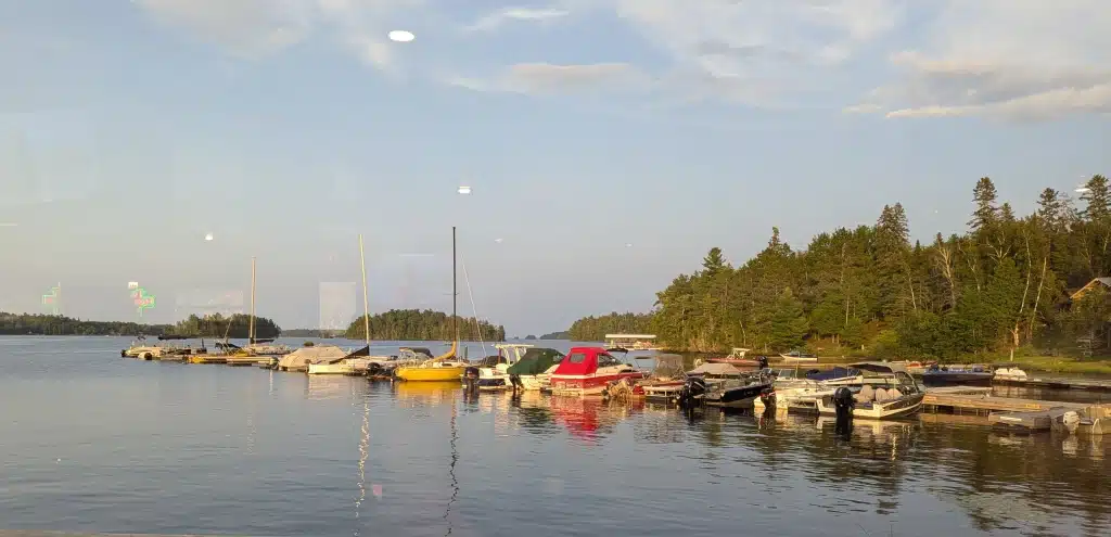 That was an excellent tip! We drove up the shore to Silver Bay where we found Gooseberry Falls State Park. We stretched our legs hiking there and the sights were absolutely amazing with views of some waterfalls and a cliff hike with vistas of the lake. I highly recommend. We wound our way to our campground in a cute little town called Littlefork, MN. The campground was very small and while I had some slight misgivings of the vibe of the place we ended up really enjoying the town. It was the first place we hauled out our bikes and got to tool around town. From there we went to Rainy Lake and, I have to say, I thought I may have started to get jaded with lake views but Rainy Lake was a sight to see. We decided to see if we could find a boat rental that day and we did! We found a great little fishing boat at Thunder Bird Lodge. The guy running the marina could not have been more helpful and we even managed to figure out how to get a MN fishing license. We spent a wonderful few hours out on the lake though sadly the fish were not biting. We swam and enjoyed the water and the sunshine. Once again we asked a local where to go next – we were pointed even further north skimming the border of Canada (quite literally) to Lake of the Woods, MN where the border is smack dab in the middle of the lake.