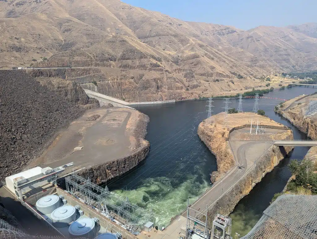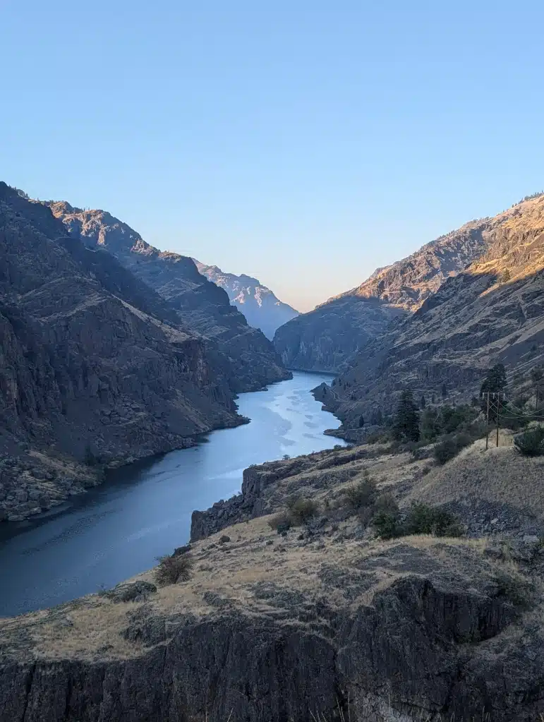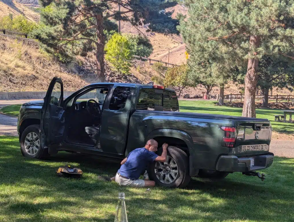 The drive took us through another range of mountains and the views were really interesting. Definitely more mountains in view and wide open land. Travis had told us that 70% of Oregan is made up of public land. Ranchers will lease the land from the government for the open grazing of livestock but much of it they did not own. We came into a town called Oxbow about 5 miles outside of hells canyon and found an RV park that had some open sites. We parked, set up and then headed out to see the canyons. Good news, bad news. The bad news is that while we were driving around looking at the Oxbow dam and Power station Gigi got a slice in her tire and started losing air. Good news is that we were close to the campground so we were able to make it back before the tire lost too much air. Jonathan attempted to fix it but it looks like we will need to change it out for the spare and get it fixed while we are out on the road again. The closest town that has anything resembling a car shop is about 30 miles away. We have no signal out here at all. It feels very far away from everything. Wish us luck. I am writing this as Jonathan is attempting to change the tire to spare. Once he does that we will head out to see the canyon.
