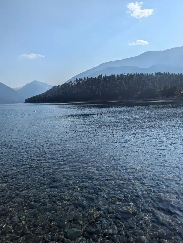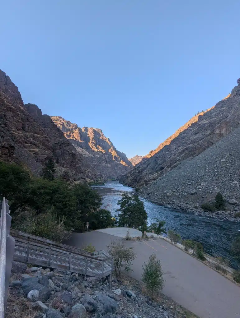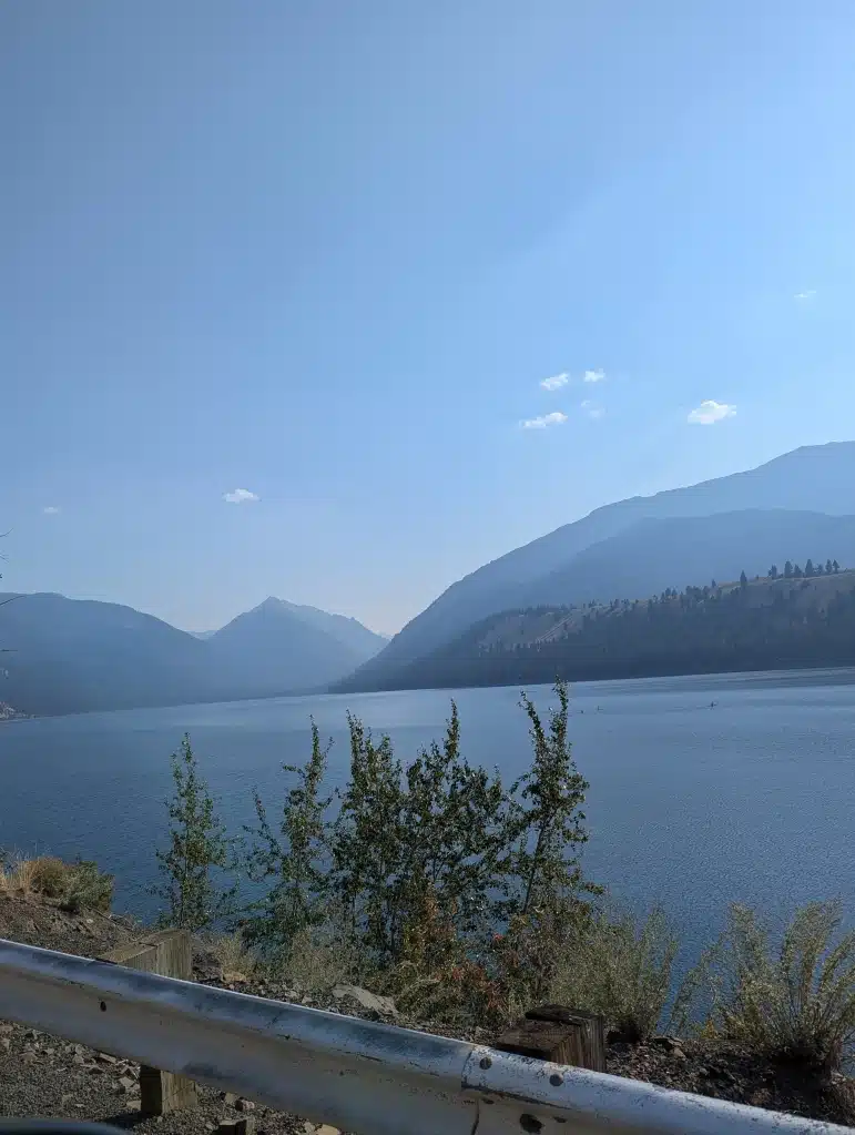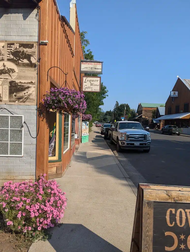 We spent the morning in a town called Halfway, Oregon getting the tire fixed. We were lucky that the local repair shop could fit us in otherwise it was another 30 miles to another town). So we got to see Halfway which was actually kind of fun. We were pointed to the only breakfast spot which was a food truck and man, that breakfast burrito was tasty! There was a liquor store called Halfway Sober which made us chuckle and it was a cute town. Interesting fact about Halfway was that during Covid as a promotional stunt they renamed the town temporarily to Half.com as a sponsorship by a company of the same name. Once the tire was done we headed out to the Hells Canyon overlook (23 miles up switchback roads) and then onto a town we were referred to called Joseph (an additional 27 miles up switchback roads). It was a fun day. The ride was both exciting and scary We saw mule deer and cattle on the road. The view was nice but not as impressive as it could have been due to the smoke from the local fires. The town was very cute. Touristy but had some nice shops and we had a good lunch at a local place where we got into interesting conversations with the locals. There was a really nice lake nearby where we took a dip to cool off. The daytime temps are brutal but at least the nights are cool.
