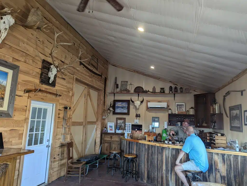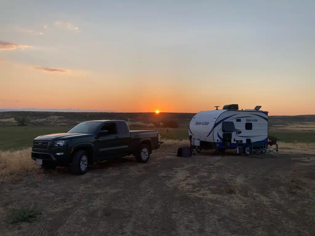 We then headed out to our final destination of the day, Copper Belt Wineries. You know the phrase, “turn off the paved road” well yes, that definitely applies. We bumped down about 12 miles of gravely dirt roads which got more and more remote. The hills were beautiful and, if the place had not gotten such great reviews, I might have been worried but after some bumping and jostling we found the winery. There were no grape vines since they had two different locations for growing wine not far from the ranch (which is where we were staying) and did the processing and bottling at the ranch. We were met by Micheal who was Travis (the winemakers) dad who let us know where to fill for water and where to park. The Ranch was definitely a working ranch and they had defined parking spaces with picnic tables for us to park at. We were the only ones there at the time so we got the prime space away from it all. We later found out the HH pretty much saved their business during Covid because people took to the open roads since it was the only thing they could do. To this day HH provides quite a bit of business for them with about 300 people coming through every summer. Pretty amazing. I now understood the dedication to the spaces for HH people. We set up and Michael gave us a wine tasting and history lesson. His family had been homesteading on that land since 1842 and he had some great stories to tell of his family. While we were learning all about the history of the place we were tasting the wine…and I loved it. I liked pretty much every wine he put in front of me. The dryness of the landscape and their wines lended itself to dry ones. They even had a port like wine that was delicious. Michael also gave us a tour of the place. We had a great time. As we were finishing our wine tasting (and buying) another set of HH’s showed up. They seemed very nice and took a spot right by the ranch. They had a cute dog. We started talking and they seemed like a really interesting couple so we invited them up to our camper after they did their tasting. Needless to say it was a really fun and interesting evening. Speaking to Jane and her husband over a bottle of wine was a really enjoyable way to spend the night. While the days are hot the evenings get cool (just like a desert) so it was good socializing and then, sleeping weather. The sunset was gorgeous and, at night, we could hear the coyotes singing and what I think may have been Elk. The landscape was beautiful overlooking 70 acres of meadows and grassland. It is one of the most scenic HH locations we have been to. We saw mule deer and cattle and the sounds of wildlife. At night the stars were amazing to see.