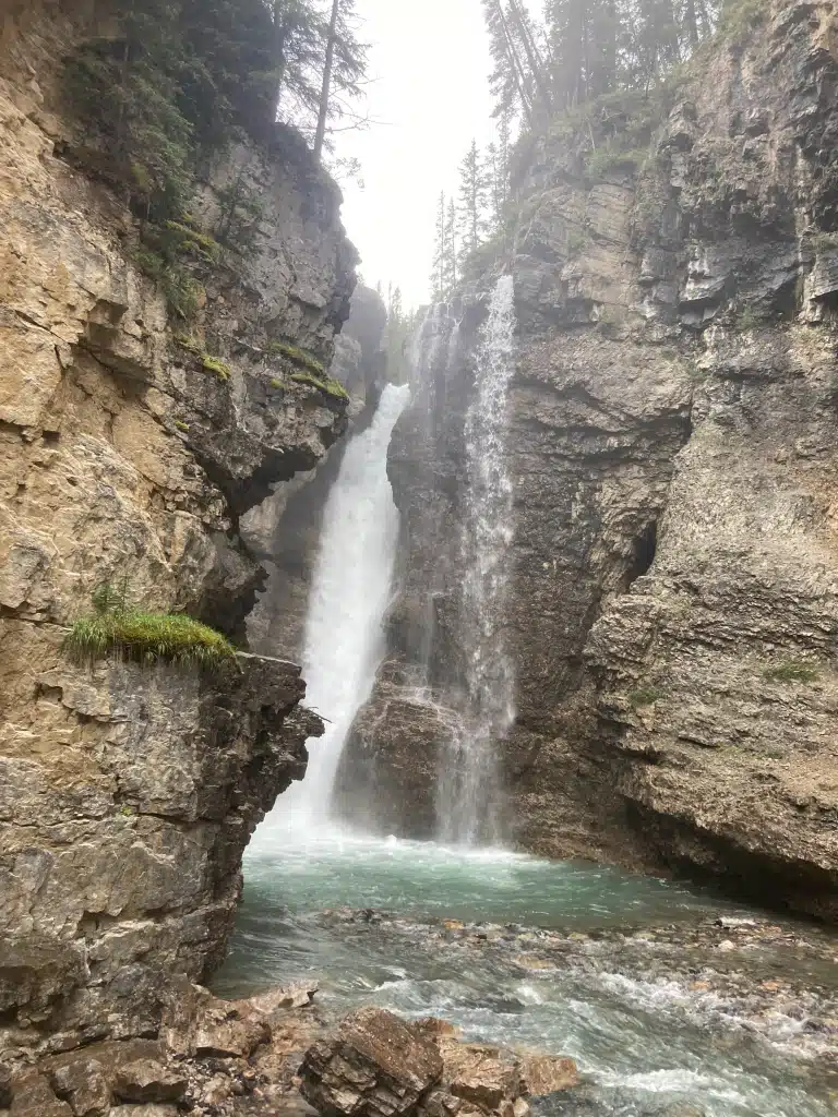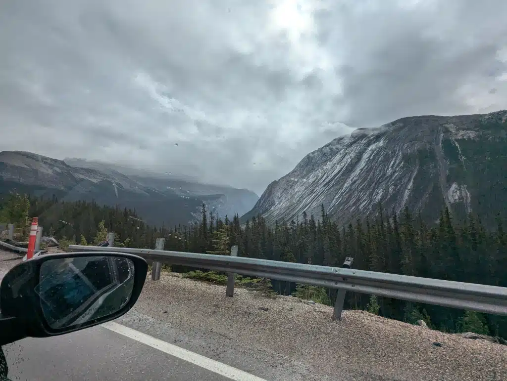 As we were driving up North to catch 93 (the Icefields Parkway) we were greeted by a beautiful rainbow! We took it as a good sign. The weather was mixed but seeing the clouds dancing among the Rockies had its own beauty. We made multiple stops along the way and got a little rained on but nothing terrible and each hike gave us something new and amazing to see. We saw a roaring river with a waterfall, got to hike to the toe of a glacier and see deep valleys filled with tall pines. We entered Jasper National Park and we kept noticing the temperature keep going down and the skies getting darker and darker. The rain had started in earnest and the clouds were descending down to the point where we could not see very much. We kept driving onward to Jasper.