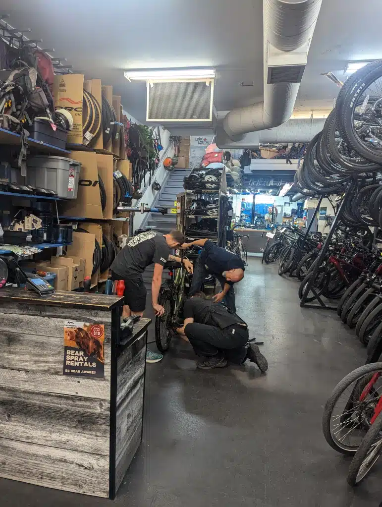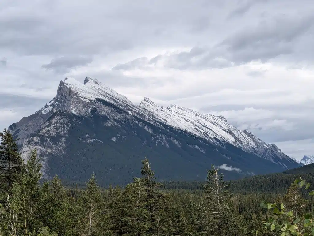 The weather the next morning called for a mostly rainy day with the rain ending around 4pm so we decided to take a slow morning and drop off our bikes to be repaired at the bike shop before heading out to some trails we had picked out. We opted for some easier trails since they would slick from the rain and snow. As we headed out to Banff we were in for another amazing surprise. What was rain for us was snow in the mountains and it was like an entire new scene with the mountains draped in snow. It was awe-inspiring even in the rain. The drive to Banff had us gawking all around us once again. The town was super busy due to the rain but we made our way to the bike shop. Sadly that shop could not help us since their mechanic was off that day but they sent us to a shop down the street. These guys were awesome and even though they were busy they dropped everything to help us. Drew at Bactrax was our hero. It took awhile but he got Jonathan’s bike back to running order and even fixed the spoke on my wheel while we were there. He was great to talk to and, if you ever need a mechanic in Banff, you should definitely go see him.