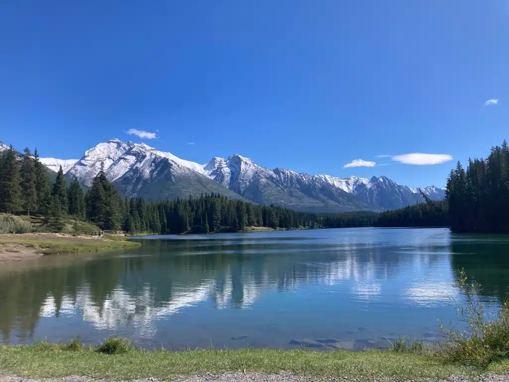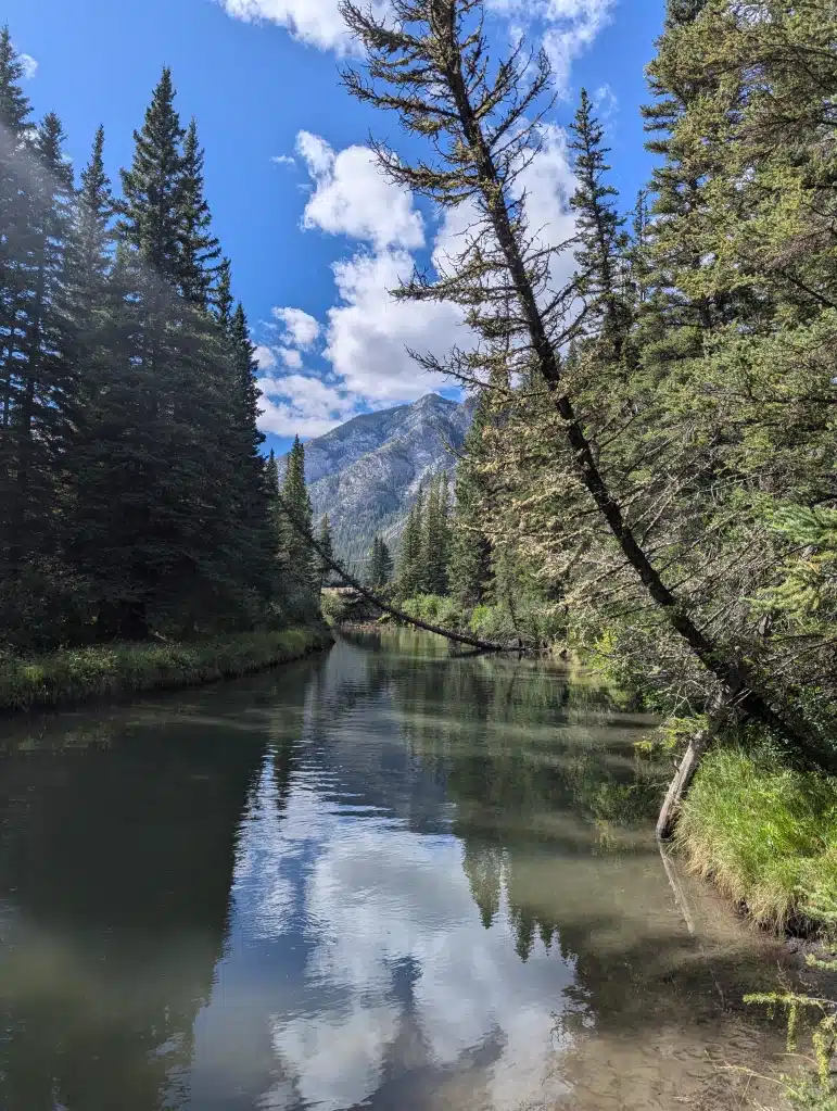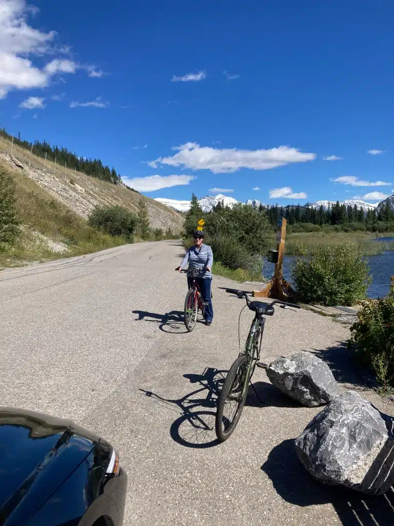 Our last day dawned bright and sunny and we were eager to explore Banff in the sunshine. We headed out to the bike trip we had planned only to discover that the bike trail was actually a road and a bit of a narrow one at that. We rejiggered our plans and found another bike path nearby to do but first we found a trail around Johnson lake. That was a gorgeous hike. Early enough that it was not crowded and the views were so gorgeous! We drove the trail that we did not bike in order to see the scenery and then headed out to the trail that the rangers recommended to us. The trail that we took was the Lake Vermillion trail which was about a 5km ride by the lake. We were not clear where to park but we found a place and headed out. Getting back on the bike always makes me feel young again. I loved it! The trail was great and the views (as everywhere in Banff) were spectacular.