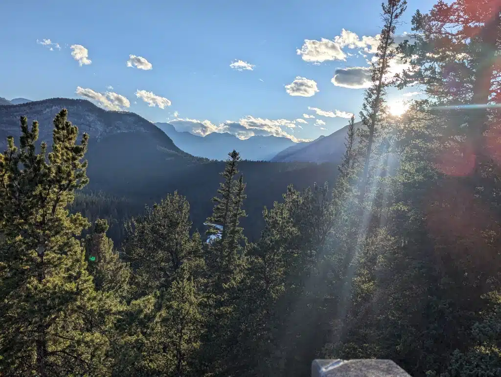 We got ourselves set up and were eager to explore. We took out the bikes and started touring around the campground to get the kinks out of our driving legs. On one turn I heard a big ka-thunk and turned around to see Jonathan looking down at his bike. Somehow the chain had gotten very very wedged in between the gears and there was no getting it out. I was grateful that we were close to home and could walk it back to the camper but we were bummed because we had been planning on biking in Banff. We shook it off and decided to go over to a nearby area that purported to have Hoo-doos. It was a stunning view across a pine carpeted valley with the Rockies in the background. Wow – just wow! We walked the small trail and looked out at the views. It was a great welcome. We decided to take the scenic drive down Tunnel Mountain road and check out the town of Banff (and see if they had a bike repair place). We could not take our eyes off of the scenery. The sun was setting and the golden light against the mountains was mesmerizing.