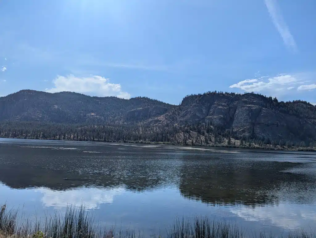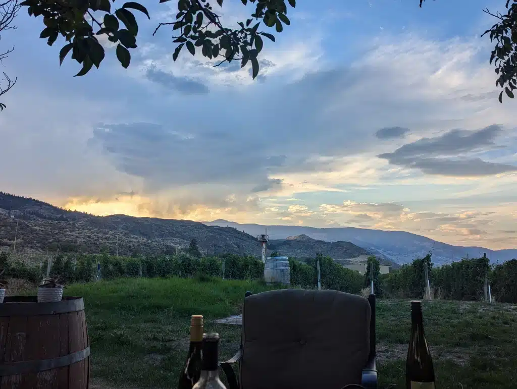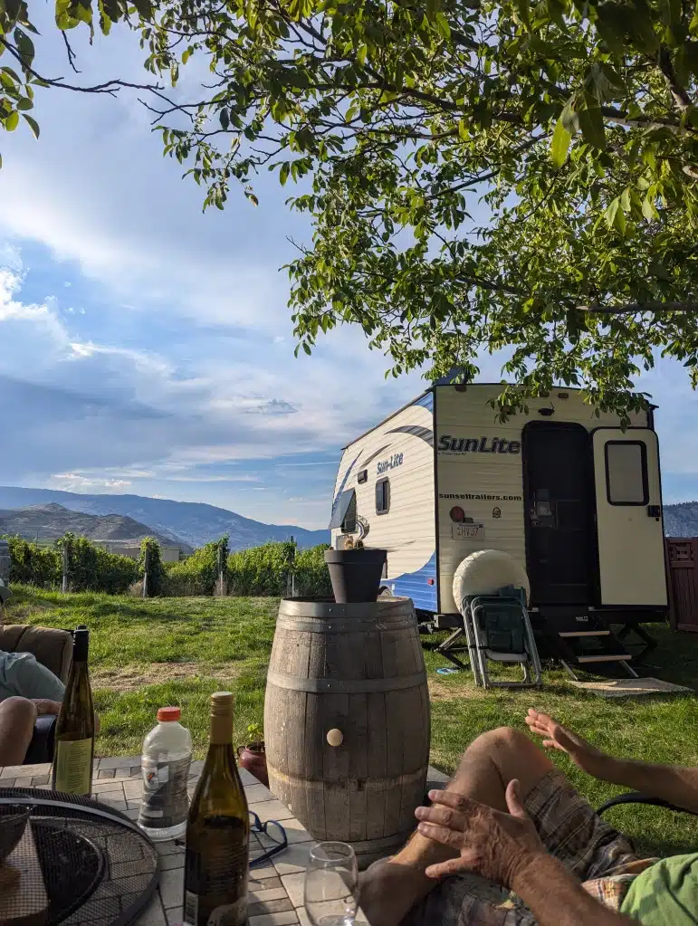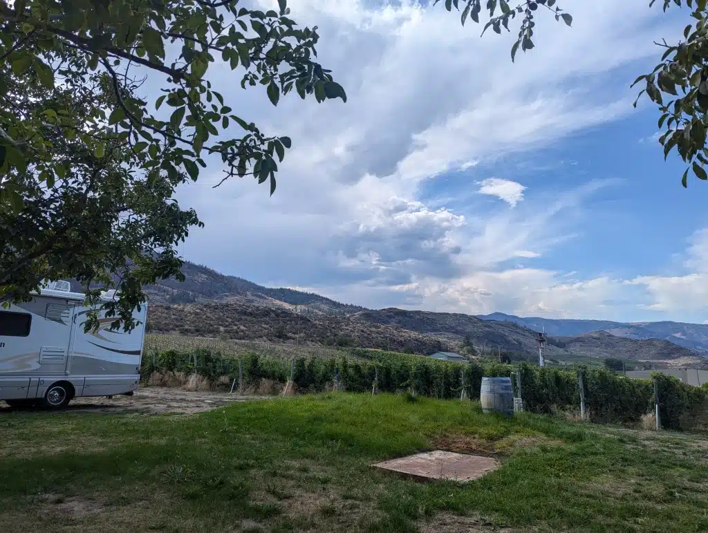 The next morning dawned gorgeous but hot. It was going to go up to 98 degrees! Our next location was a harvest host right at the border inside Canada at a local winery. We meandered our way through water views and wineries. It was just beautiful. We had lunch pulled off the side of the road looking out across the water. This is beautiful country. We arrived at our evening location. A beautiful winery in Osoyoos called Mythology Vineyard. We pulled in and while it was hot it was not uncomfortable. The site was beautiful and we met another couple who had just arrived (also Harvest Hosters) and did a tasting with them and got along great! We ended up spending the entire evening with them drinking the great wine of the area and talking about life. They were incredibly sweet and cooked us dinner. The evening was beautiful (the days are hot but the nights go down to 59 degrees) and it was time well spent.